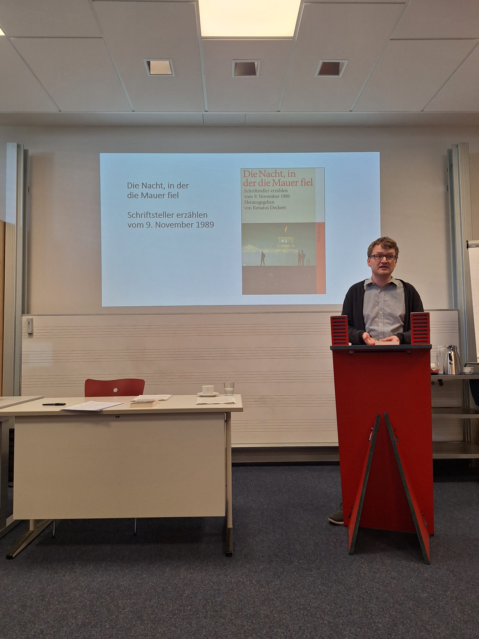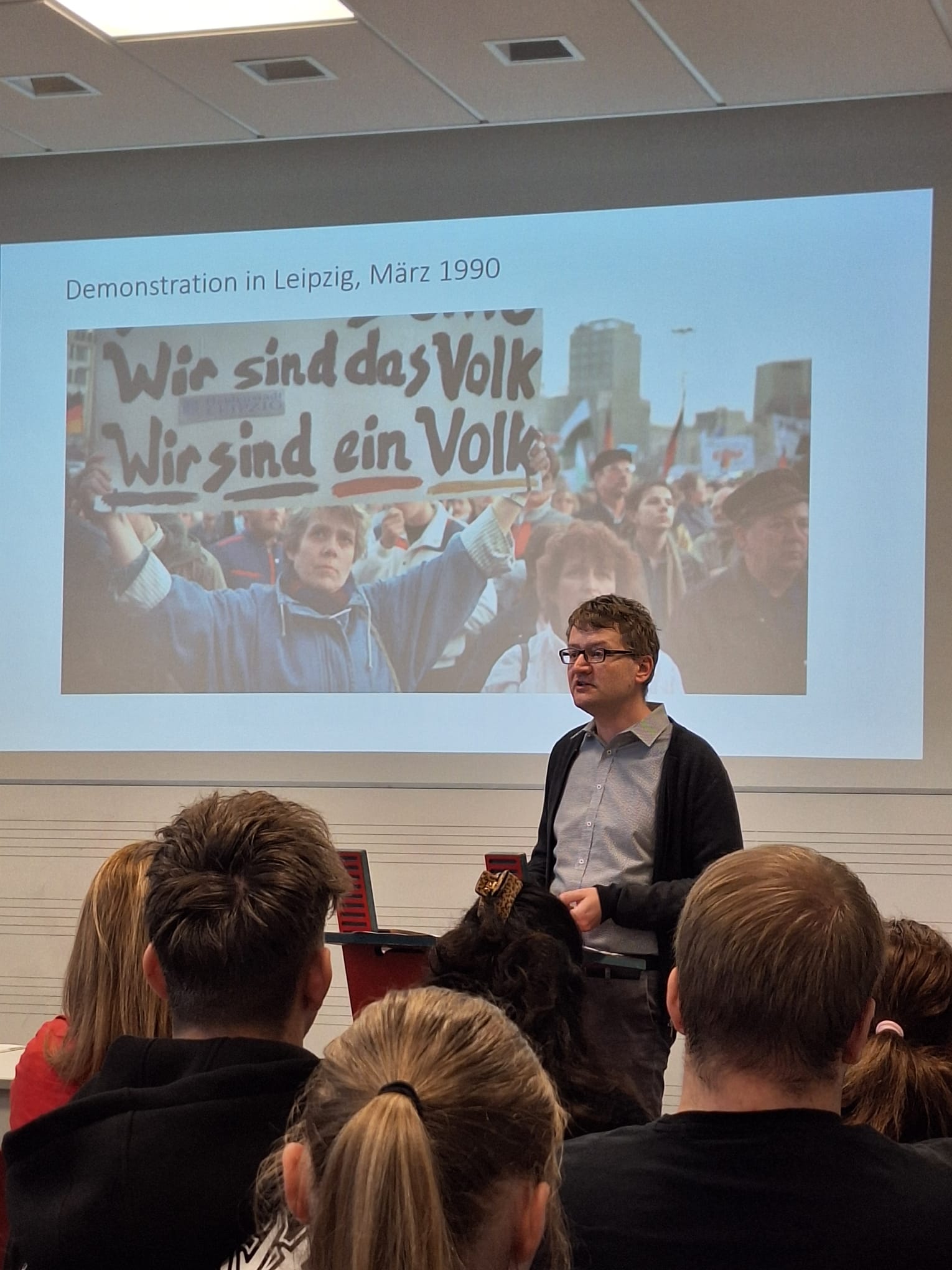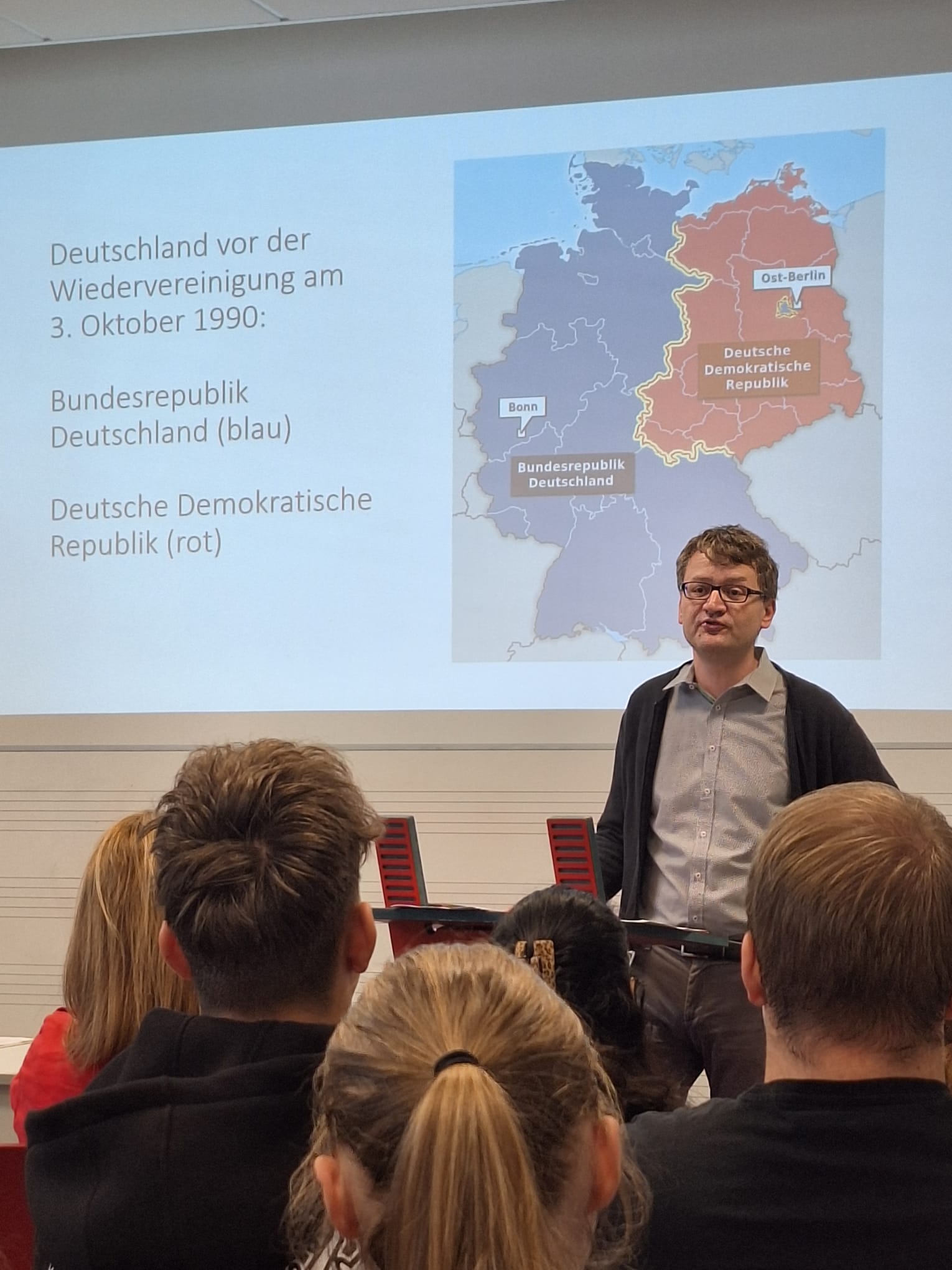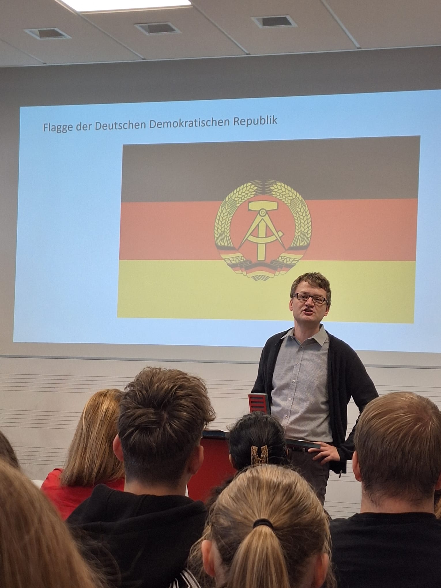 Abgerundet wurde die Woche mit einem biographischen Vortrag von Dr. Renatus Deckert, der aus seinem Leben heraus auf die Welt der DDR einging. In dem Vortrag „Die Nacht in der die Mauer fiel“ machte Deckert mit 150 Schülerinnen und Schülern gemeinsam einen Streifzug durch die DDR, bis hin zu Schabowskis Zettel und natürlich dem Mauerfall. „Wissen sie, was meine größte Errungenschaft war, nachdem die Mauer gefallen war?“ fragte er in das völlig gebannte Publikum hinein. „Ich durfte wählen gehen. Ich durfte selbstbestimmt mein Leben gesellschaftlich, aber auch politisch, gestalten. Das gab es vorher nicht.“ Mit diesem Hinweis verwies Deckert immer wieder darauf, in was für einem tollen Land, in einem wachsenden Europa wir heute Leben und das wir uns dieses Zusammenleben auf jeden Fall bewahren müssen.