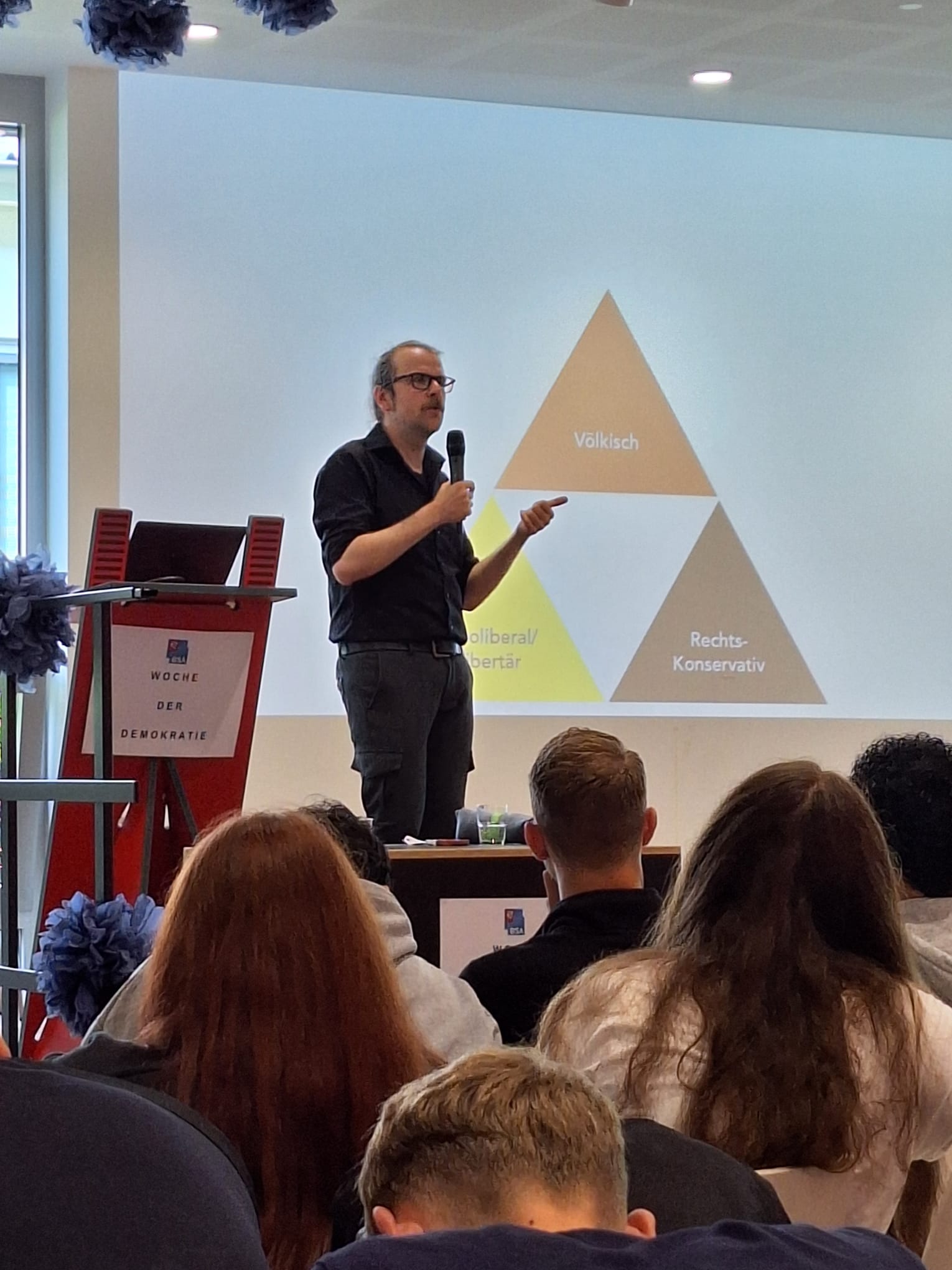 Zu Beginn der Woche referierte Sebastian Friedrich in der Aula mit seinem Vortrag „Das Erstarken von rechtsradikalen Parteien“ vor 200 Schülerinnen und Schülerin über die Errungenschaft von Demokratie in Deutschland, Europa und der globalen Welt. Immer wieder warnte er davor, was passieren kann, wenn wir das Gut der Demokratie aufs Spiel setzen. „Schützen sie die Demokratie, indem sie sich für sie einsetzen und, auch wenn es anstrengend ist, in Institutionen, Ehrenämtern oder sich sogar auch selbst politisch daran beteiligen.“ Es war ein fordernder Vortrag, in dem Friedrich die jungen Menschen mit in die gesellschafts-politische Tiefe mitnahm und in einer intensiven Auseinandersetzung die Gefahren von rechtsextremen Parteien für die Demokratie darstellte.
