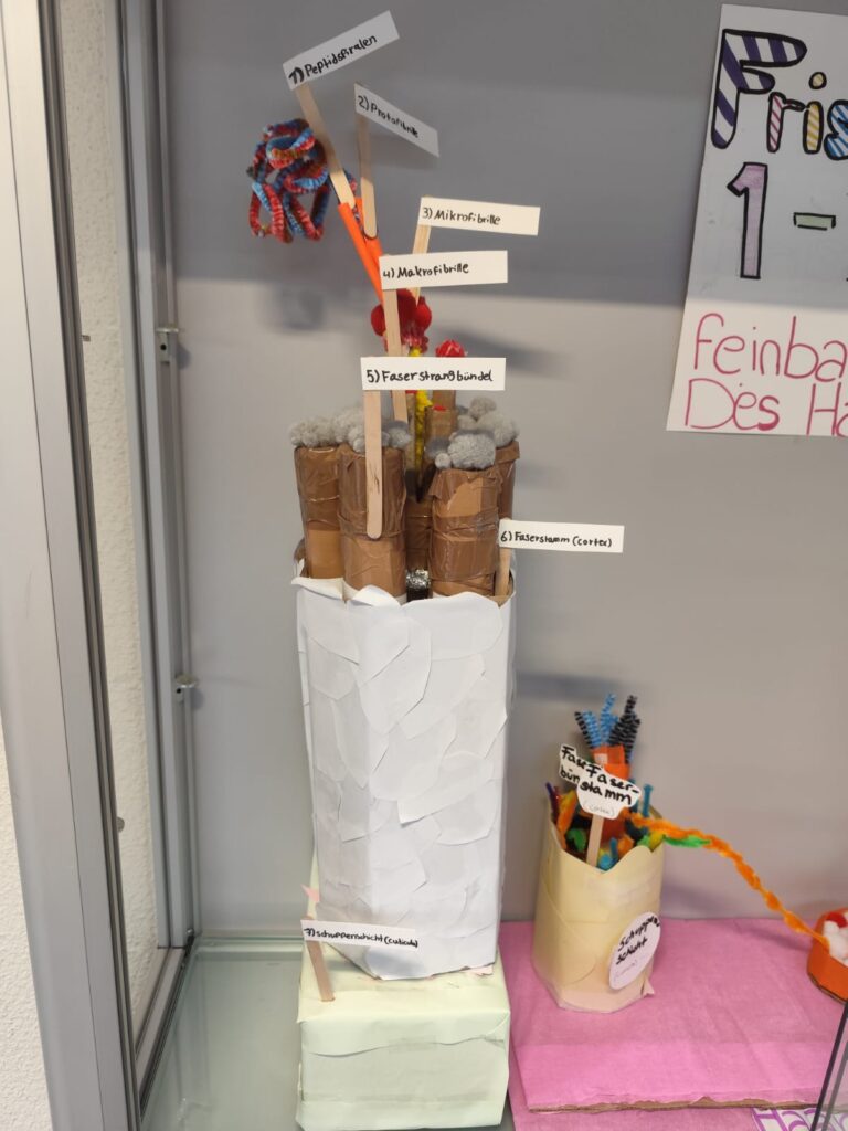 Wie sieht ein Haar eigentlich von innen aus? Diese Frage hat die Friseurklasse 1–25 im handlungsorientierten Unterricht praktisch beantwortet: Mit viel Kreativität und Fachwissen entstanden beeindruckende Modelle, die den Feinbau des Haares anschaulich darstellen – vom Markkanal bis zur Schuppenschicht.
