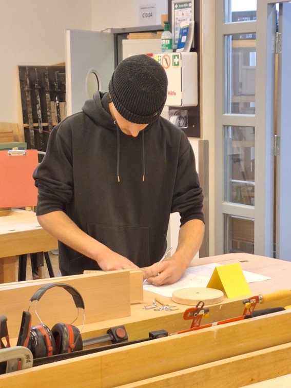 Nach dem Mittagessen ging es dann in die Zielgerade und alle waren gut dabei. Die jungen Menschen, die aus allen Kreisen Schleswig-Holsteins in die Holzwerkstatt der Beruflichen Schule Ahrensburg gekommen waren, um am Wettbewerb teilzunehmen, arbeiteten alle auf einem sehr hohen Niveau. Es wurde deutlich, dass sie auch in den Kreisen aus denen sie gekommen waren, aus Niebüll, von Sylt, aus Mölln, Itzehoe, aus allen Himmelsrichtungen, zurecht die besten Prüfungen im praktischen Bereich absolviert hatten.