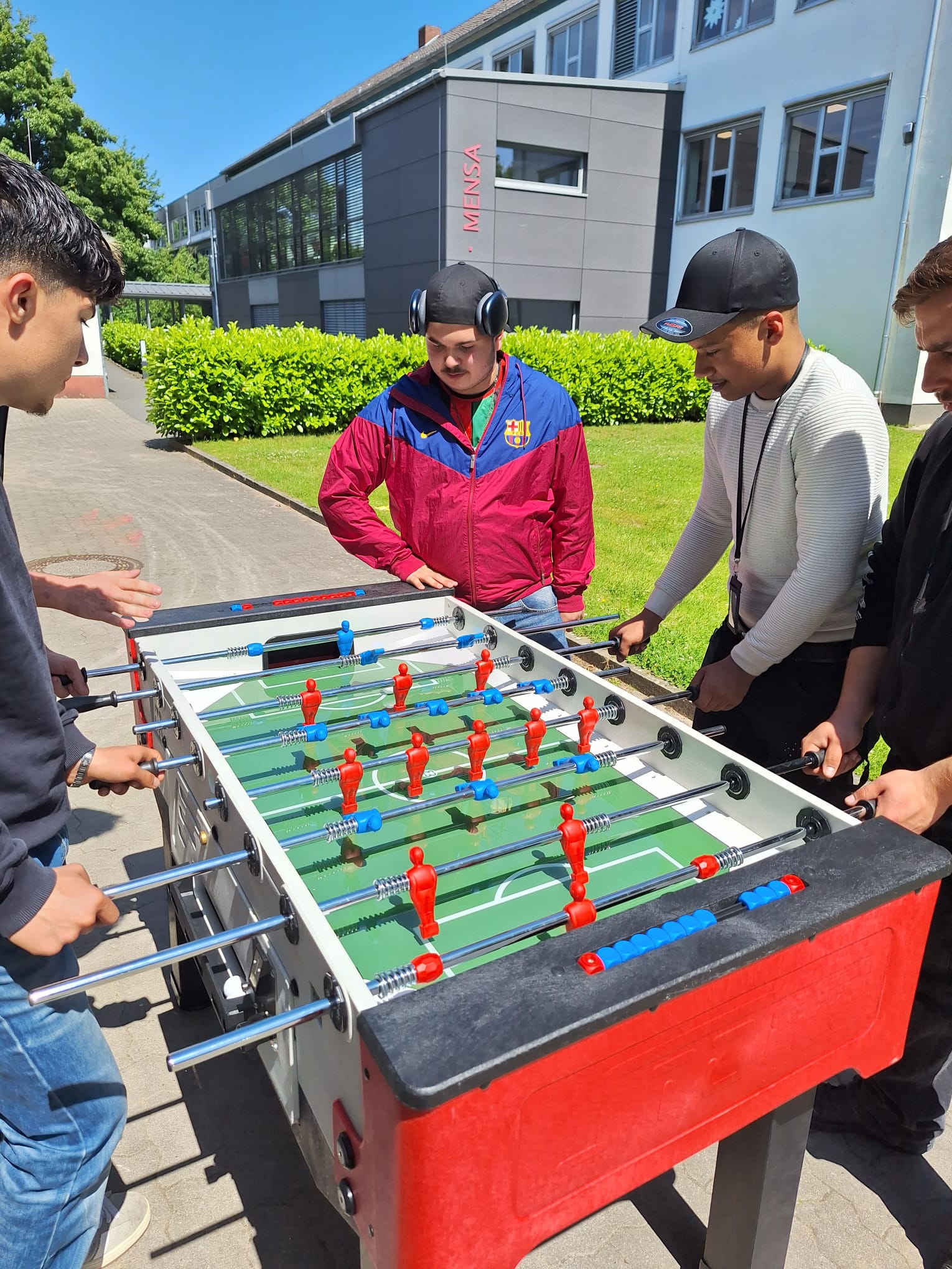 Der Kickertisch kommt zeitnah in das Gebäude L, sobald die fehlende Glasabdeckung nachgeliefert worden ist. Die nächste Überlegung ist ein Basketballkorb, auch eine Idee der Schüler/-innenabfrage, für den gerade ein Platz für ein Feld gesucht wird.