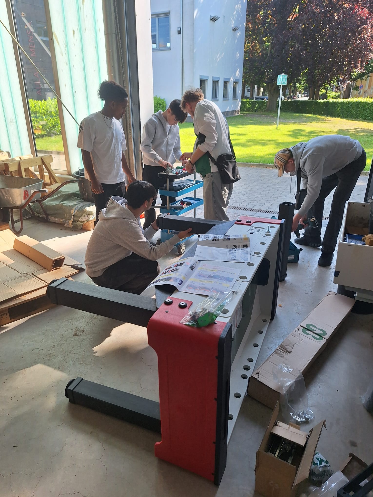 Der Kickertisch war das kompliziertere Spielgerät, zumindest was den Aufbau betraf. Doch eine Klasse aus dem Fachbereich Möbel-, Küchen- und Umzugsservice, „echte Macher“, nahmen sich die Aufbauanleitung zur Hand und setzten das Projekt an einem Vormittag um. Nach dem Zusammenbau wurde natürlich noch ein klasseninternes Kickerturnier gespielt. „Der Kickertisch ist auf jeden Fall bespielbar“, so einer der Schüler, nachdem er das Turnier gewonnen hatte.
